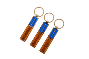 Metallschlüsselanhänger. Beidseitig mit einem Doming-Aufkleber versehen. Das braune PU-Band (Schlaufe) ist ebenfalls mit einer Blindprägung versehen.